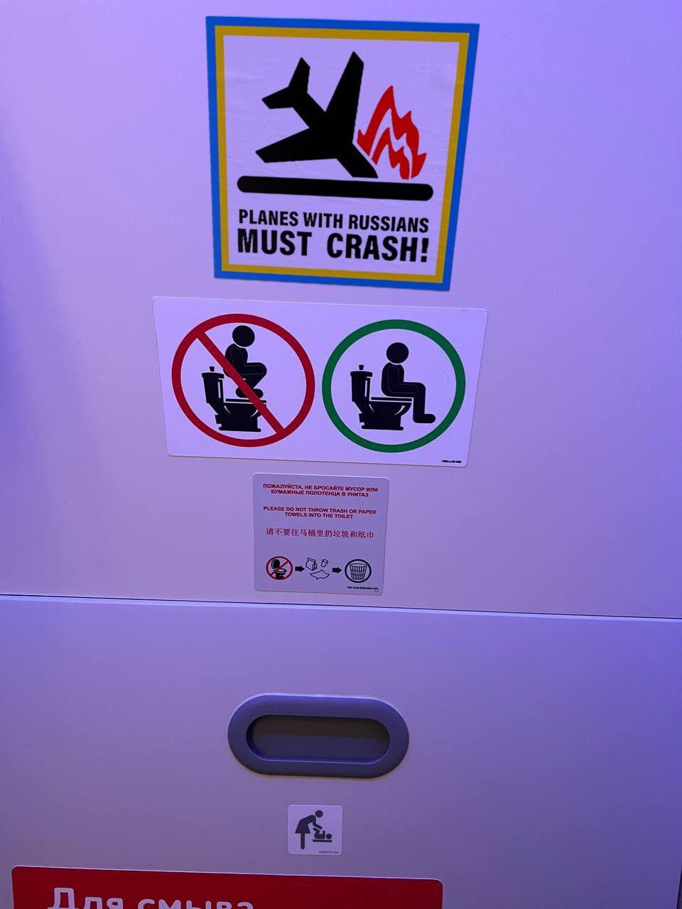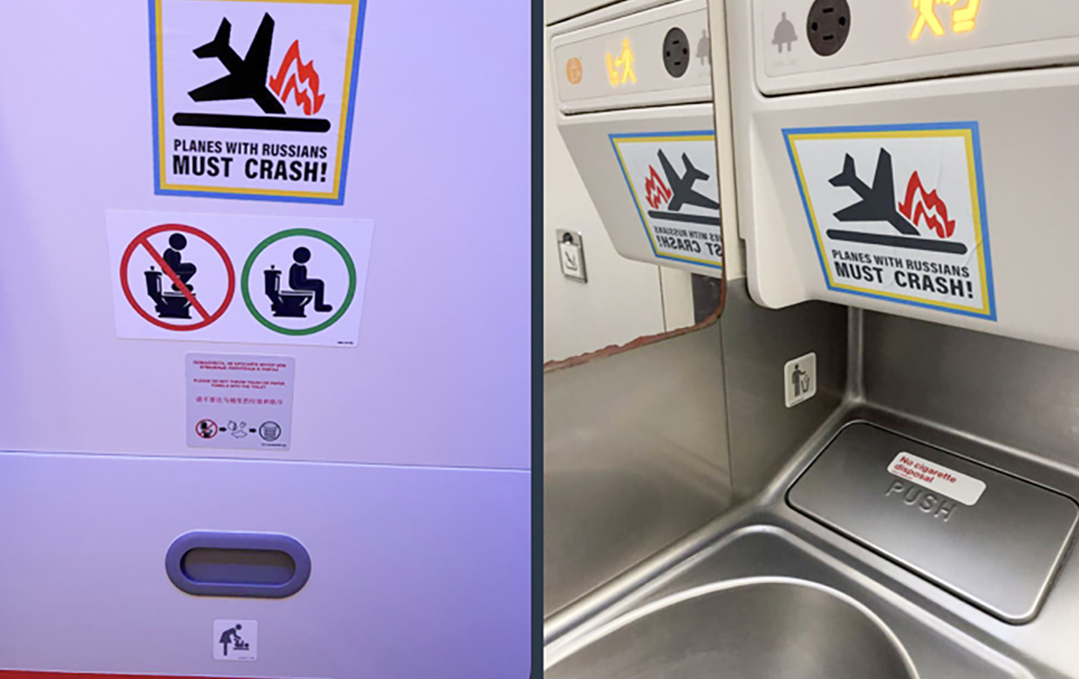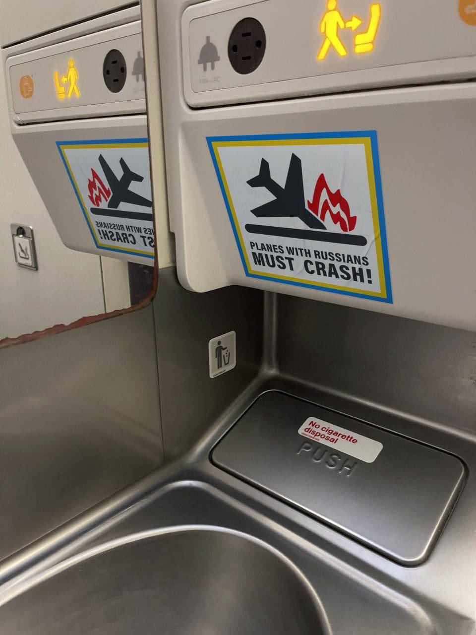 Rahvusvaheliste lennufirmade lennukitesse on hakatud kleepima venelaste-vastaseid kleepse, mis kutsuvad üles kukutama alla lennukeid, millega sõidavad venelased.