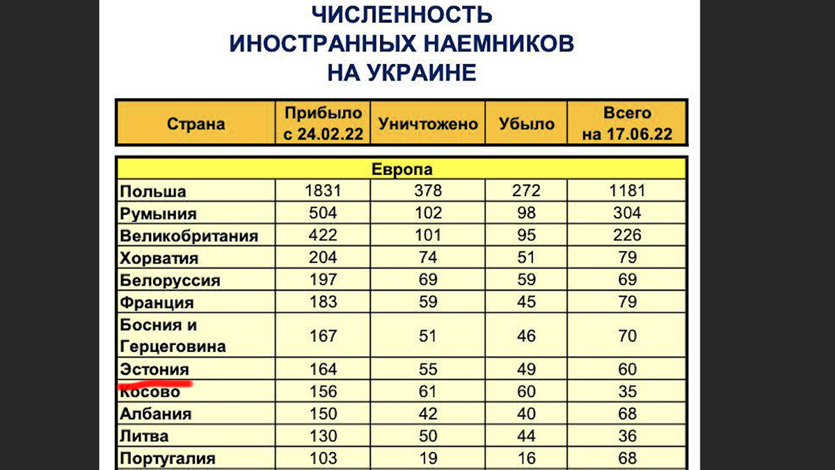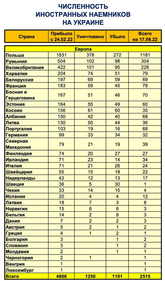 Vene luure andmetel on välisriikidest läinud Ukrainasse sõdima alates tänavuse aasta 24. veebruarist 6956 (Euroopast 4866) võitlejat, kellest hukkunud on 1956 (Euroopast 1250), lahkunud 1779 (Euroopast 1101) ja rivis on veel 3221 (Euroopast 2515).