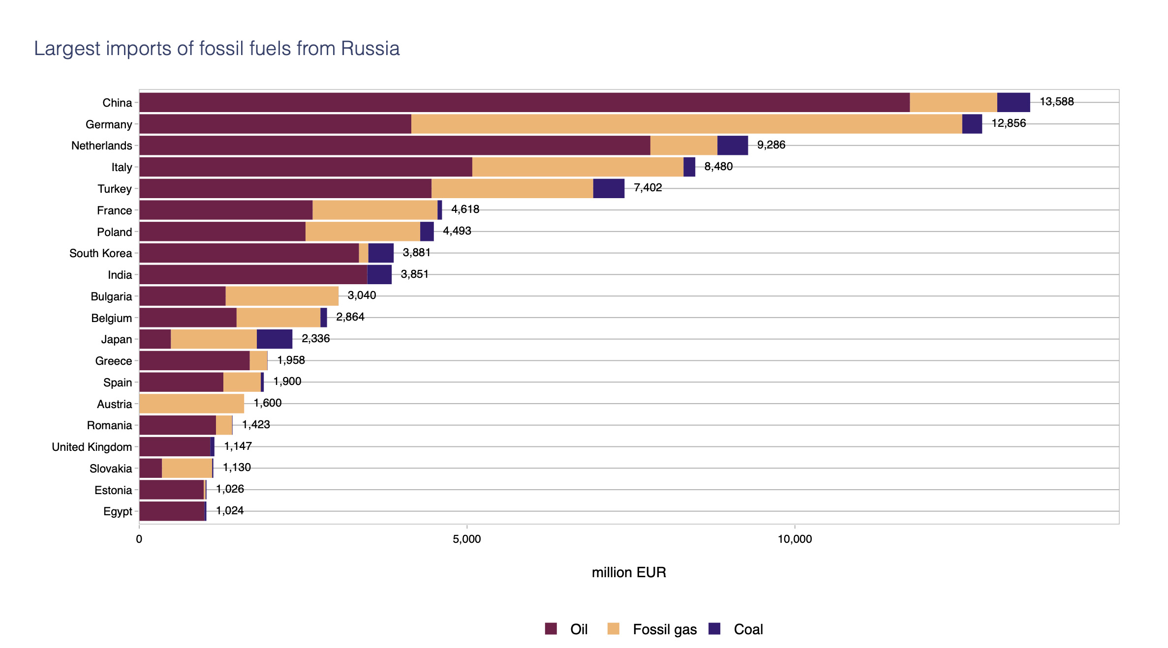 CREA arvestuse kohaselt teenis Venemaa 100 päevaga kütuste müügist 93 miljardit eurot. Kõige suuremad panustajad on olnud Hiina (13 miljardit), Saksamaa (12 miljardit), Holland (9 miljardit), Itaalia (8 miljardit), Türgi (7 miljardit), Prantsusmaa (4 miljardit)ja Poola (4 miljardit).