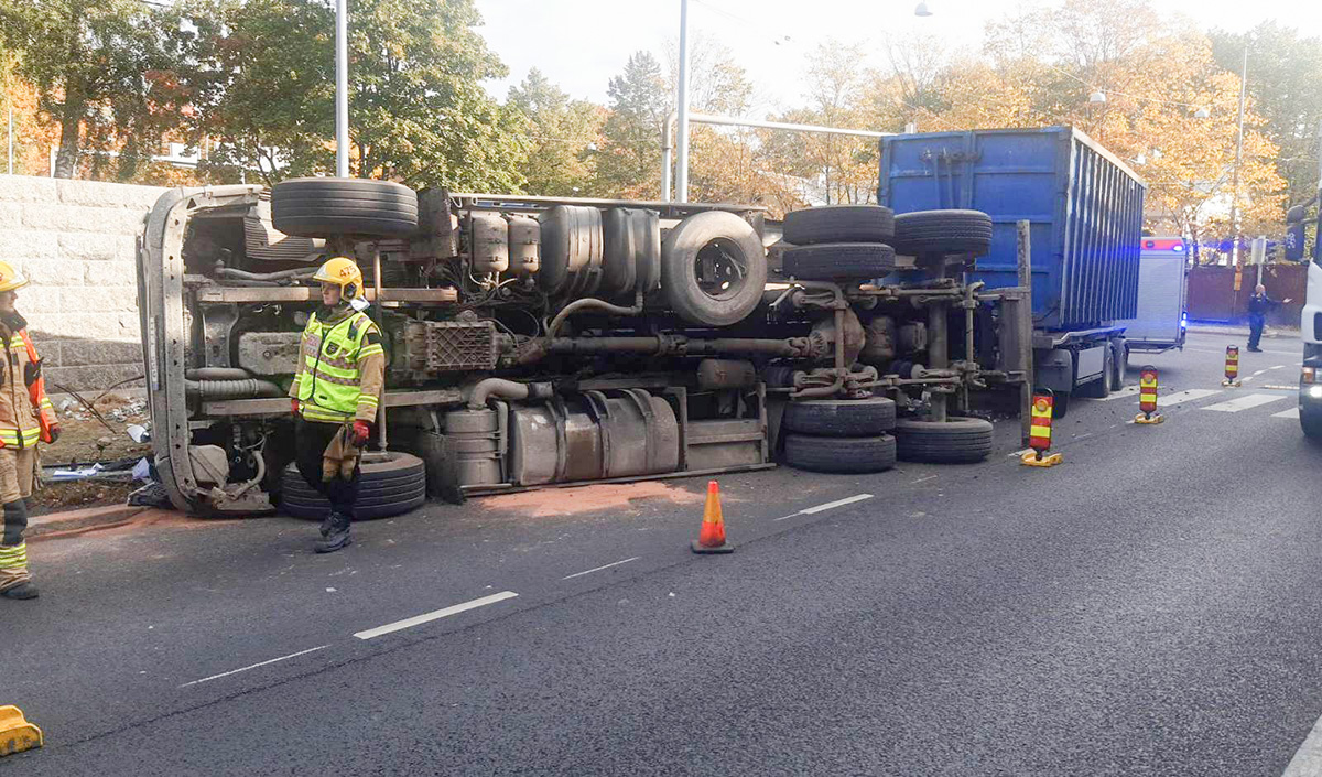 Helsingi kesklinnas Mechelininkatu ja Porkkalankatu ristmikul kukkus tänase neljapäeva, 22. septembri hommikul suur veok külili.