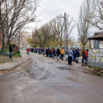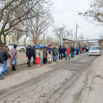 Piltidel on inimesed ootamas veejärjekorras Ukrainas Dnipro linnas.