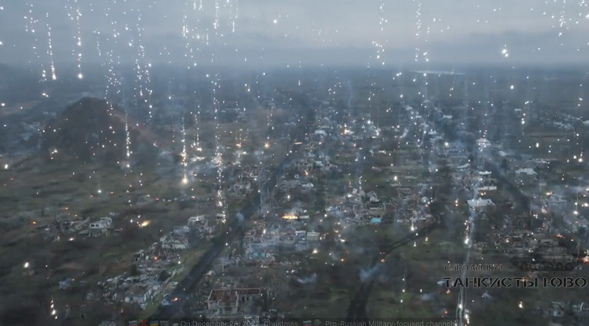 Videos on näha, et külast pole suurt midagi alles jäänud. Taevast langevad aga alla tulekerad, mis meenutavad lund.