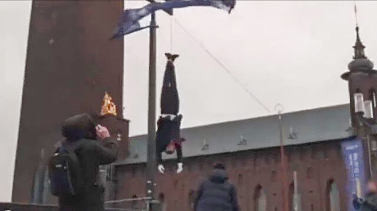 Türgi presidendi nõunik Ayhan Ogan on jaganud sotsiaalmeedias pilti selle kohta, kuidas Rootsi pealinnas Stockholmis riputati president Recep Tayyip Erdoğani kuju jalgupidi võllapuu külge.