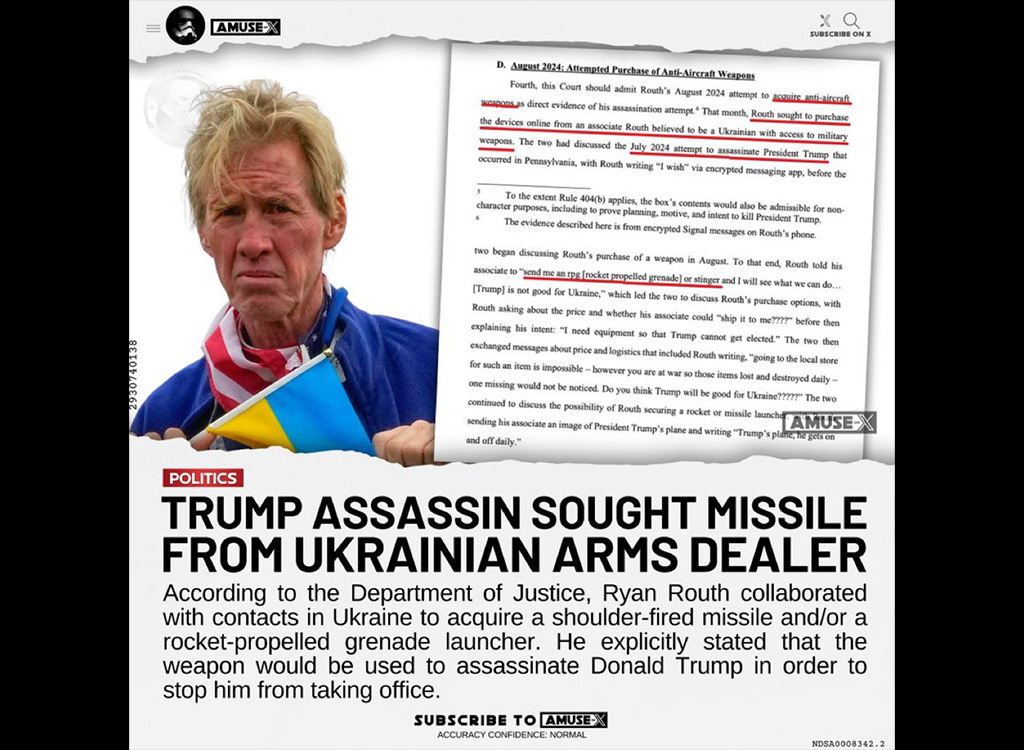USA justiitsministeeriumi info kohaselt võttis Ryan Routh ühendust Ukraina võimudega, et osta neilt õlalt lastav rakett ja/või raketi tüüpi granaadiheitja. Ta andis teada, et see oleks mõeldud Dolald Trumpi mõrvamiseks, et Trump ei saaks kunagi ametisse astuda.