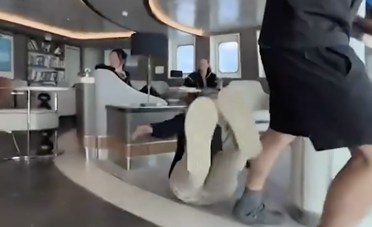 Videos on näha, kuidas lained suurt laeva kõigutavad. Reisijatel oli raskusi püsti jäämisega.