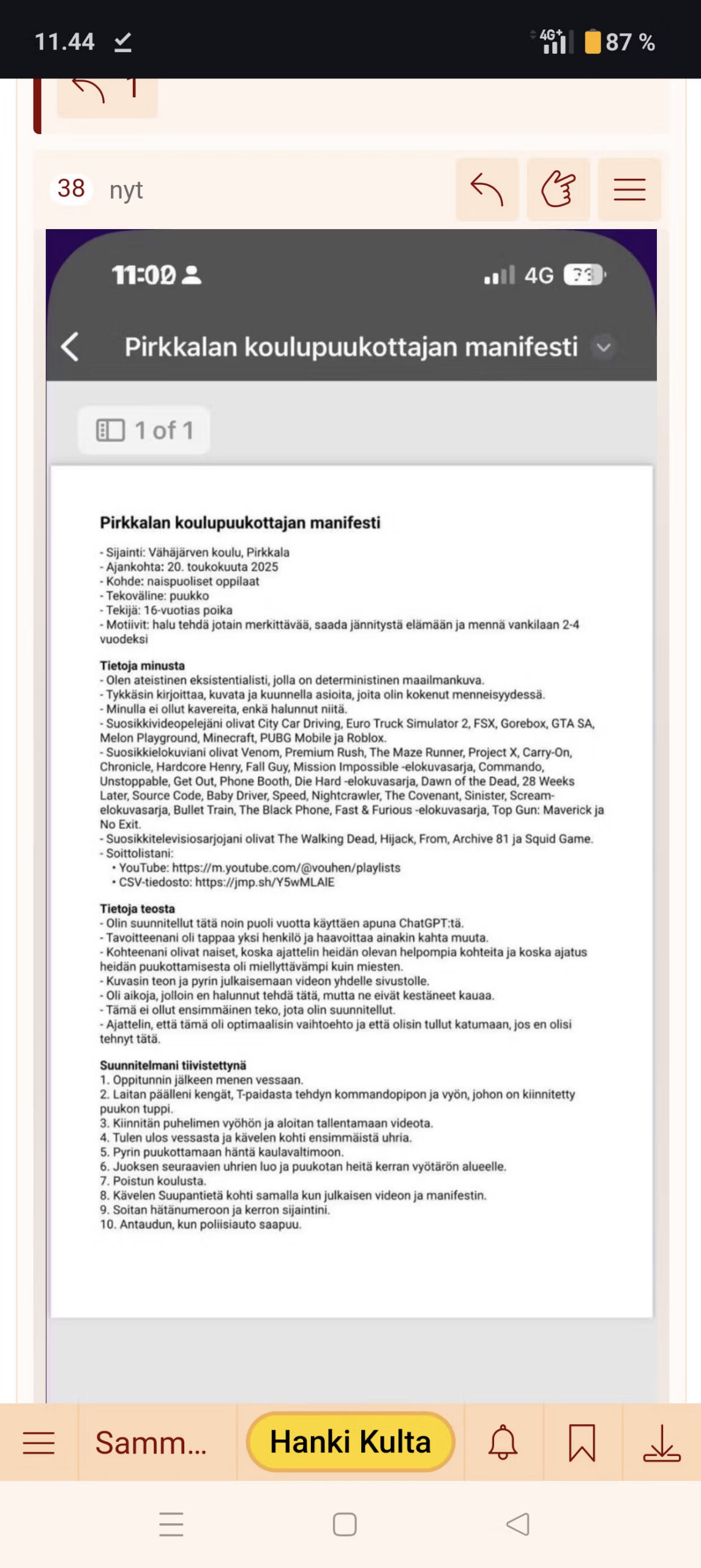 Kell 10.41 ilmus tema endiste koolisõprade Whatsappi grupis omamoodi manifest. Minut hiljem saabus sama teade ka Iltalehti toimetusse.