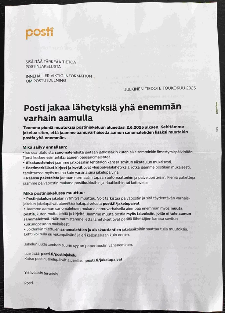 Posti on muudatusest sel nädalal teada andnud, jagades Helsingis postkastidesse teateid. Enne Helsingit on muudatusest mõjutatud piirkondades sarnast teadet jagatud ka Espoos, Forssas, Poris, Kuopios ja Jyväskyläs.