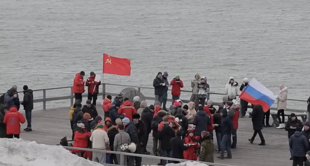 Linna kahe põhimaantee ristumiskohas seisab seltskond inimesi, kes kannavad kahte tüüpi lippe: vene triibulised ja erkpunased nõukogude omad. Venemaa näitab, kes tema arvates seda kohta kontrollib, vahendab Yle.