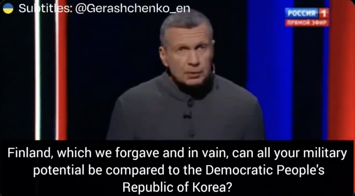Soome sai Venemaa riigitelevisioonis taas karme ähvardusi. Teleajakirjanik Vladimir Solovjov, üks Kremli peamisi propagandiste hoiatas, et Soome ja Rootsi armeed ei saa vastu Põhja-Korea sõduritele.