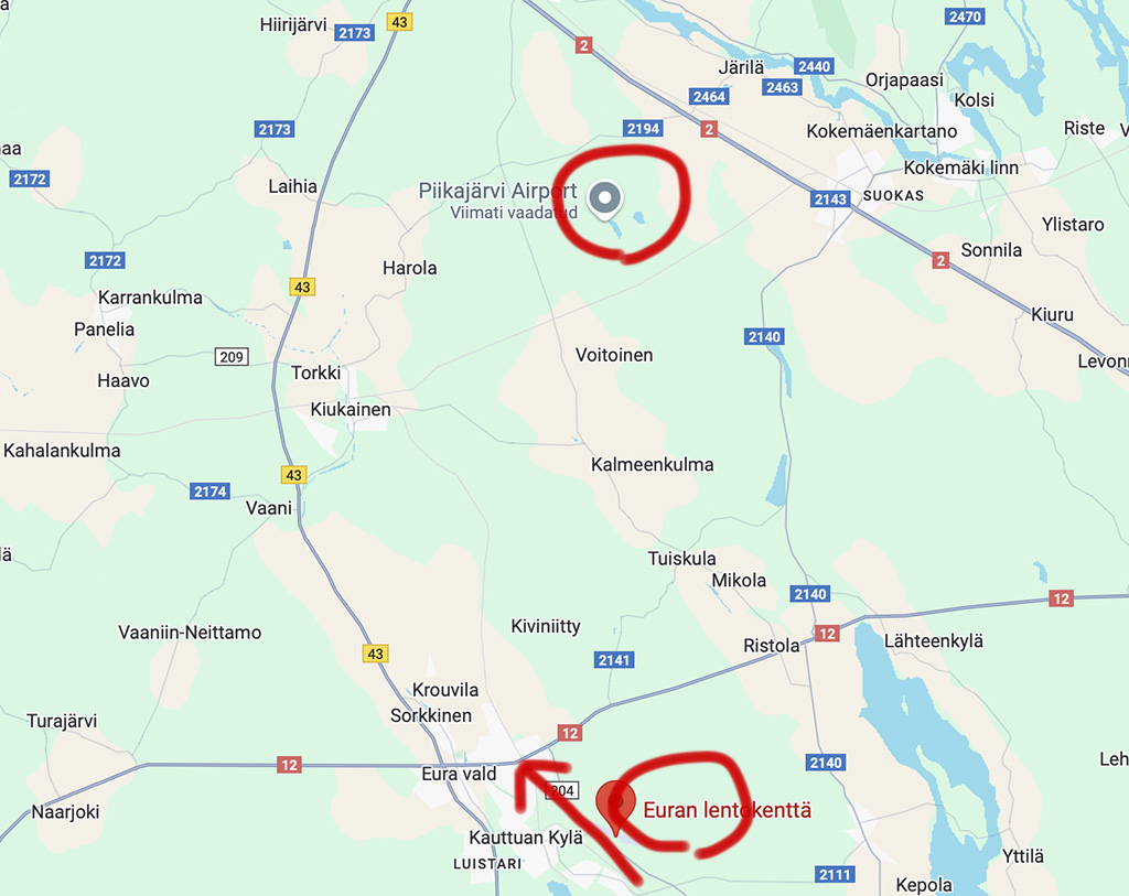 Eura lennuvälja juurest Piikajärvi lennuvälja juurde on maad 20 kilomeetrit.