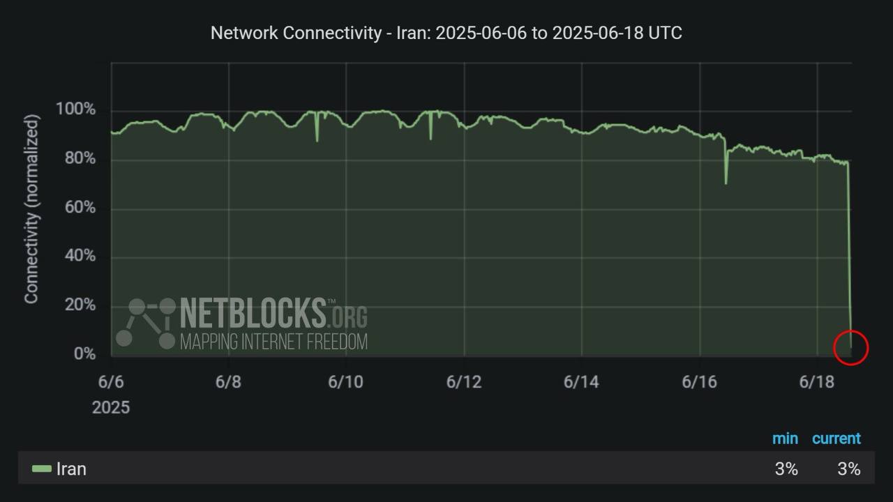 Interneti jälgimisteenuse NetBlocks andmetel on Iisraeliga toimunud vastastikuse rünnakute ajal kogu Iraanis registreeritud peaaegu täielik internetiühenduse katkestus.