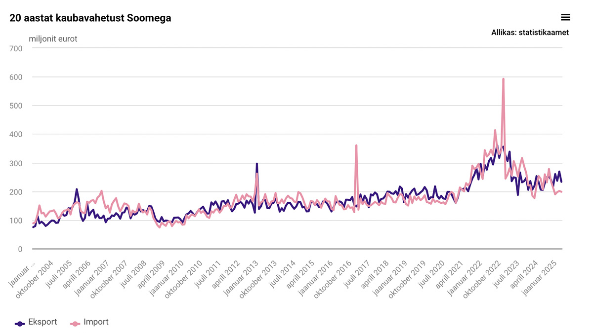 2024. aastal vähenes kaupade eksport Soome võrreldes 2023. aastaga 11% ja import 16%. Kaupu eksporditi sinna mullu jooksevhindades 2,74 miljardi euro eest ning imporditi sealt pea sama palju ehk 2,72 miljardi euro eest. Kaubavahetus Soomega moodustas Eesti koguekspordist 16% ja koguimpordist 13%. „Soomega oli möödunud aastal meie kaubandusbilanss 21 miljoni euro võrra plussis ehk me eksportisime Soome mõnevõrra rohkem kui sealt importisime,” sõnas Puura.