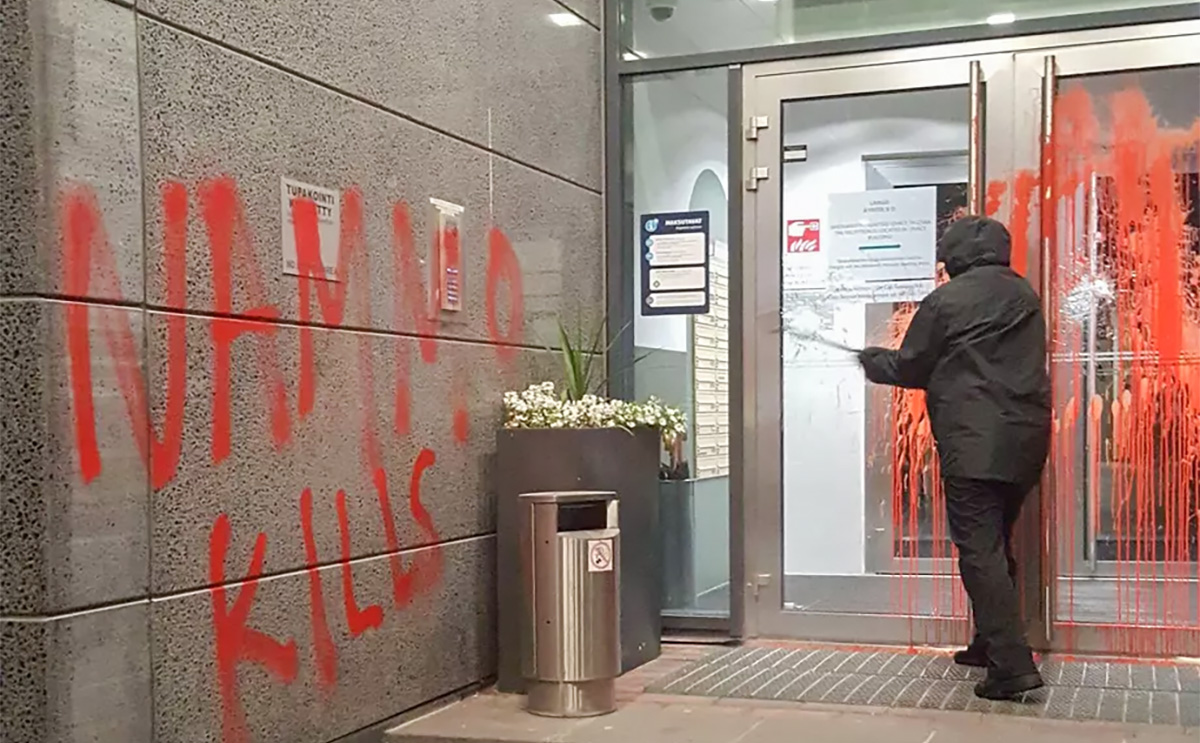 Aktivistid joonistasid kontori seinale punase värviga teksti „Nammo tapab” ja lõhkusid aknad. Aktivistide meediakajastustest selgub, et nad kahjustasid ka kontori välisust.