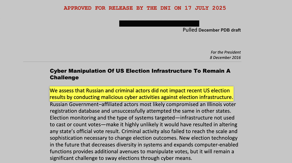 Dokumendist tuleb välja, et Venemaa häkkis sisse valimisinfosüsteemi ja hankis infot valimisnimekirjade kohta, aga see ei mõjutanud valimistulemust.