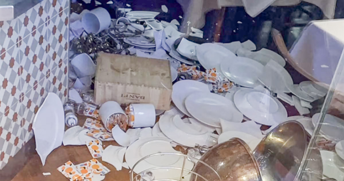 Yle sai juhtumi kohta šokeerivaid kaadreid, millel on näha purunenud veinipudelid, portselan ja serveerimisnõud.