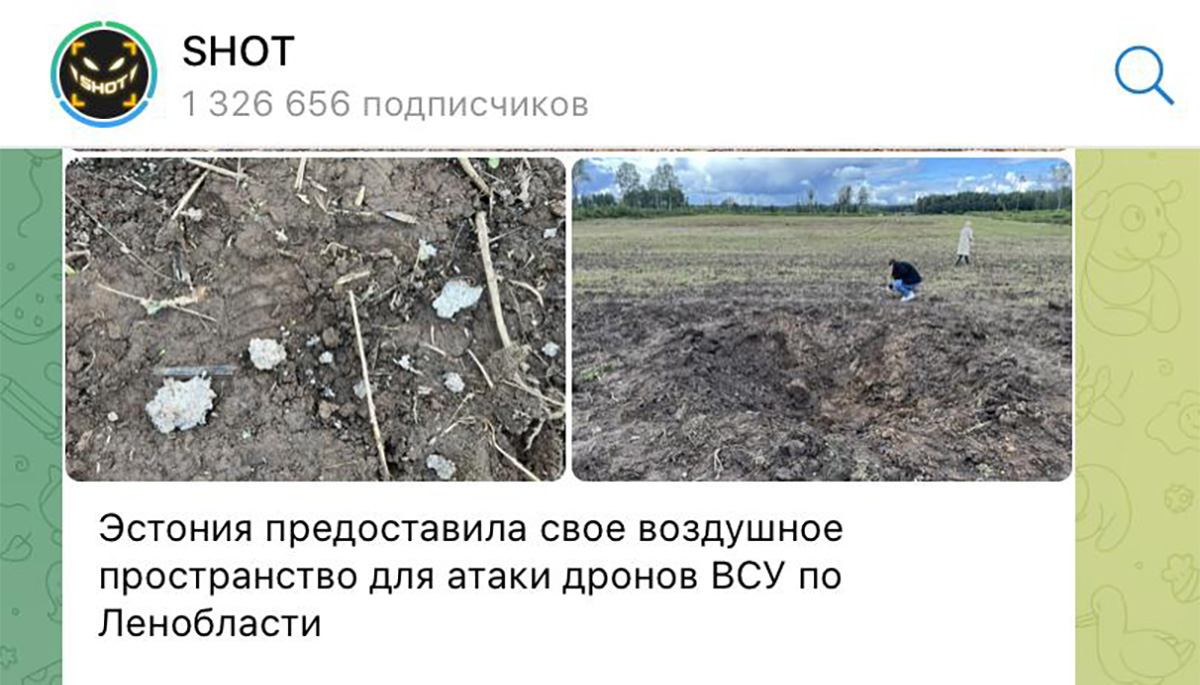 Kanal märgib, et täna leiti Eesti territooriumilt Ukraina drooni rusud. Need leiti Võrtsjärve lähedalt, 40 kilomeetri kauguselt Tartust ja umbes 100 kilomeetri kauguselt Venemaa piirist. Plahvatuse tagajärjel tekkis suur kraater ning rünnakukohas registreeriti ka rünnakuks kasutatud löögielemendid.