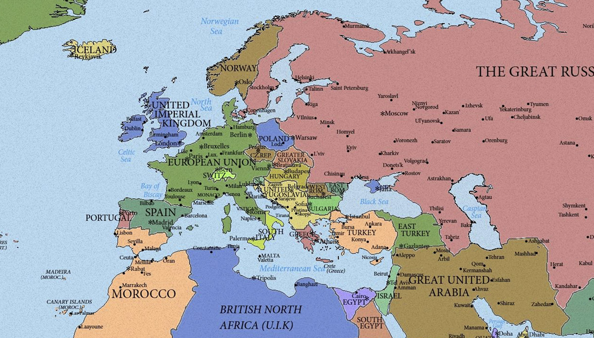 Lisaks on Venemaa osad pool Rootsit (teine pool kuulub Norrale) ja pool Poolat (piir läheb Varssavi juurest), samuti Kaukaasia ja Kesk-Aasia riigid, sealhulgas Afganistan.