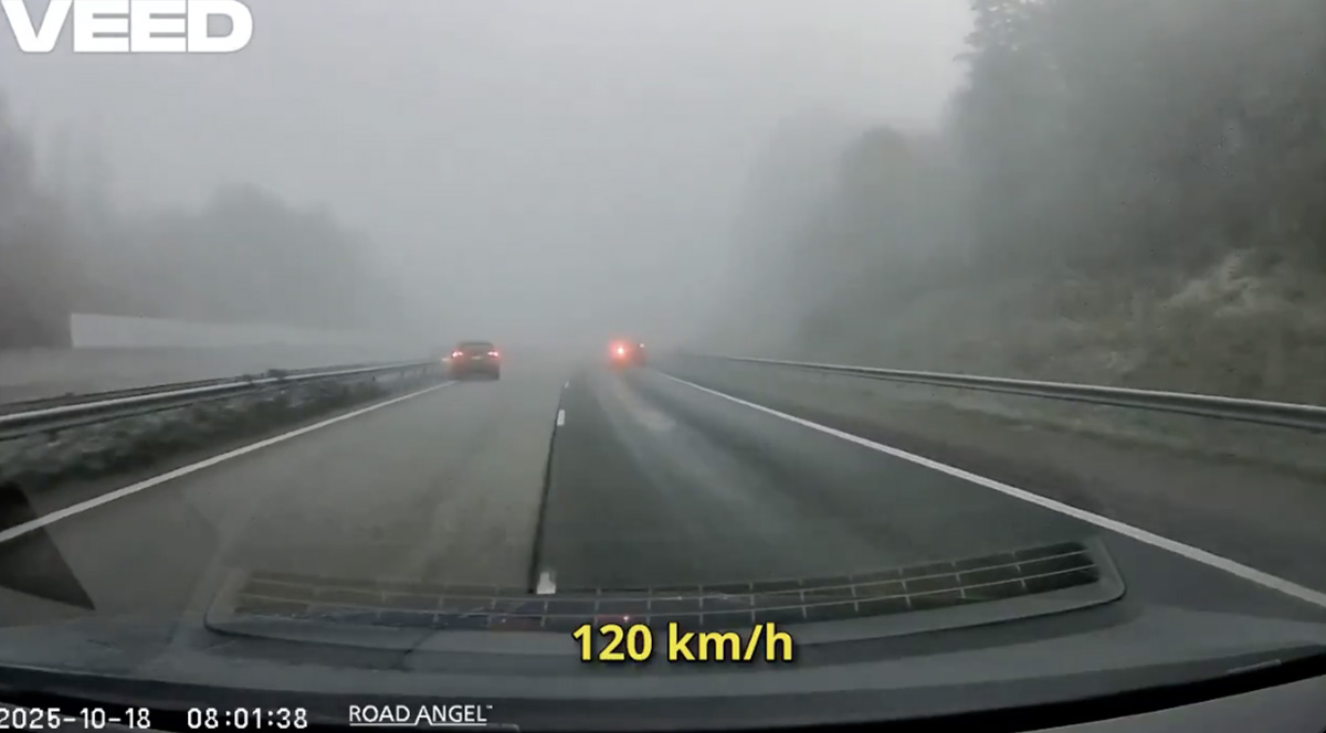 Ja tässä Väinö kyntää vasenta kaistaa jäisellä moottoritiellä sumussa 132 km/h. Näkyvyyttä noin 150 metriä.