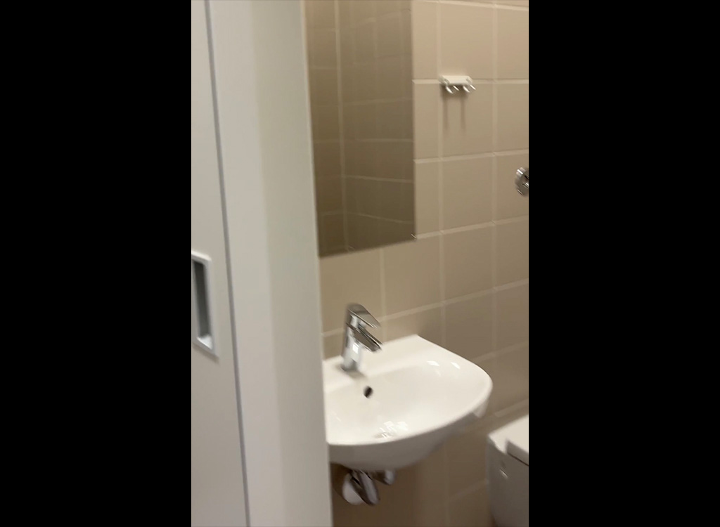 Kohe ukse kõrval asub kongis väike vannituba, kus on tualett, kraanikauss ja dušš. Vannitoa lükandukse vastas on peegel.