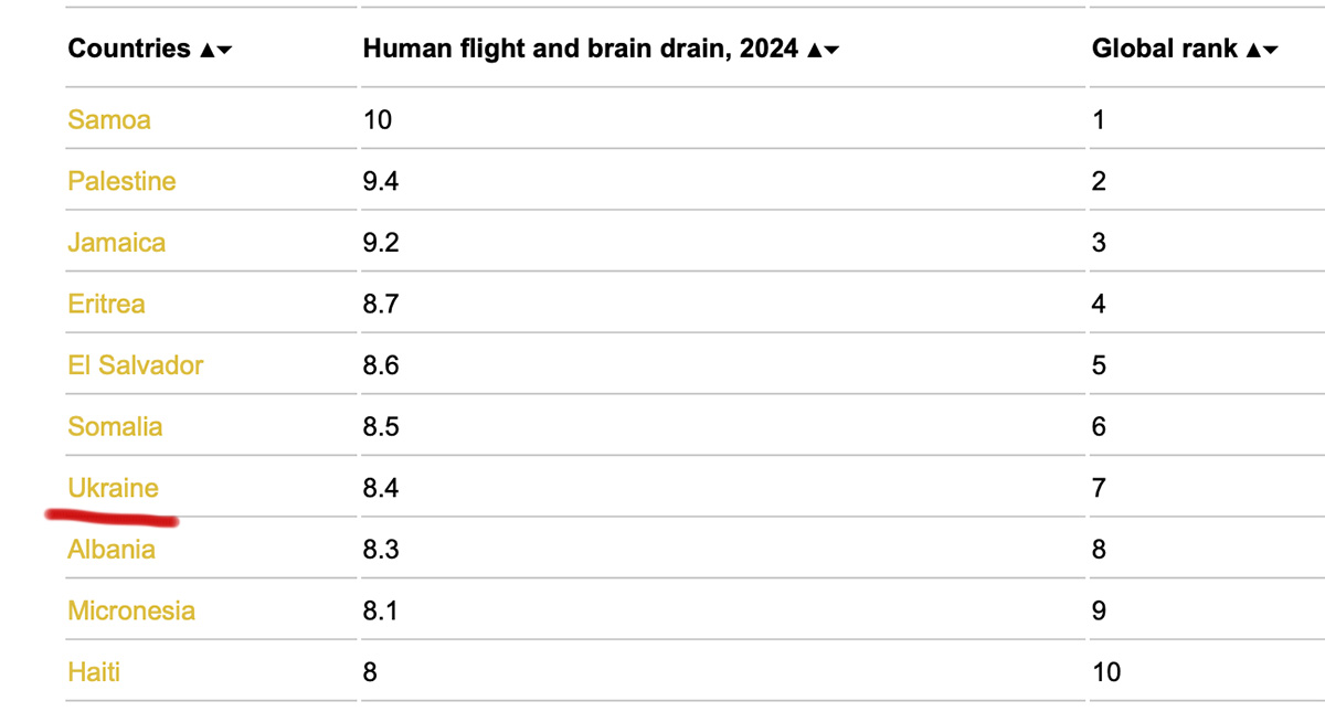 Sõda on toomas Ukrainale pikaajalist ja pöördumatut kahju, kuna riigist voolavad ajud välja. Ukraina on vastavas maailma edetabelis kõrgel 7. kohal Somaalia ja Albaania vahel.