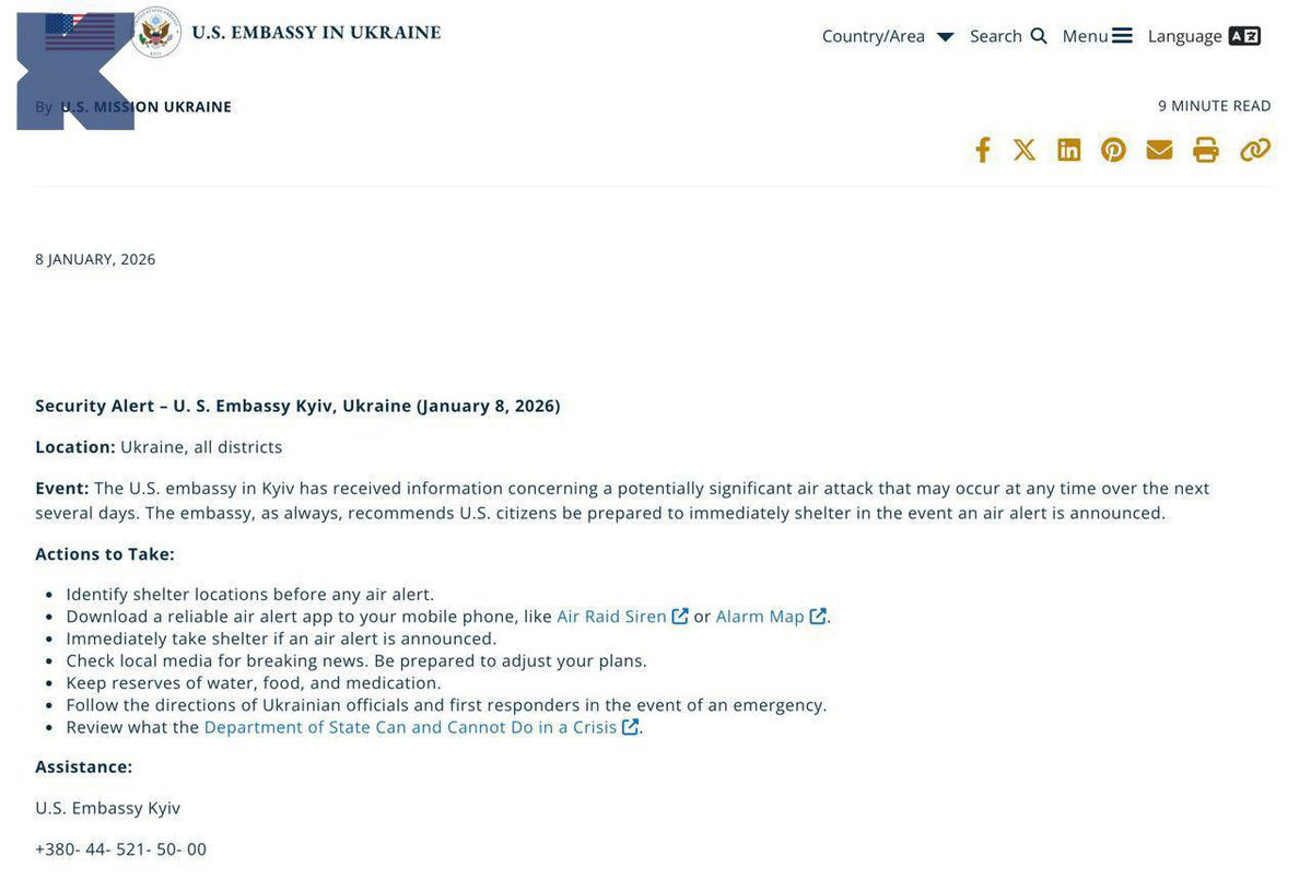 🚨🇺🇸🇺🇦 U.S. Embassy in Kyiv warns of a possible Oreshnik intermediate-range ballistic missile (IRBM) strike – a major aerial attack that could occur in the coming days.