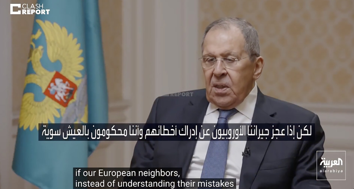 „Teate, Venemaa – see on tsivilisatsioon,” sõnas Lavrov, „mitte nii vana nagu terve rida teisi tsivilisatsioone, nagu Hiina, India ja Osmani omad, aga me oleme Araabiaga enam-vähem samavanused. Ilmselt on see vastastikuse sümpaatia täiendav faktor. Sõda me ei otsi, sõda me ei taha. Aga kui need meie Euroopa naabrid, selle asemel, et oma vigadest aru saada, ja mõista, et meil tuleb niikuinii koos elada, kui nad selle arusaamise asemel valmistavad ette sõda meie vastu, nagu nad on kuulutanud, siis president on korduvalt sel teemal rääkinud ja tuletanud meelde, et Ukrainas viime läbi sõjalist erioperatsiooni, aga kui nad tahavad sõda, siis saab see olema hoopis teine sõda hoopis muude vahenditega.”
