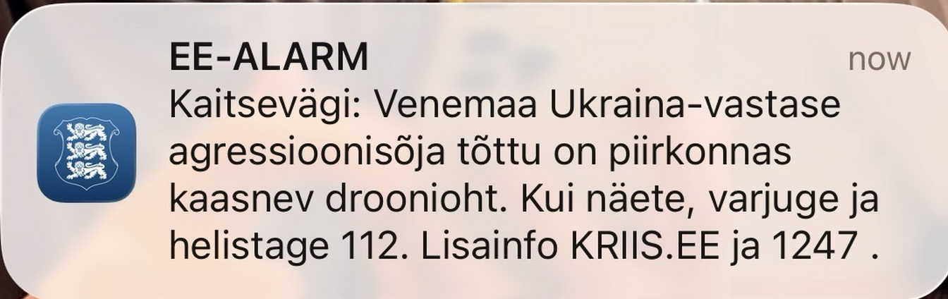Ohuteavituse süsteemi EE-ALARM saatis kolmapäeva hommikul kell 8.43 üle Eesti inimeste mobiiltelefonidesse teavituse: „Kaitsevägi: Venemaa Ukraina-vastase agressioonisõja tõttu on piirkonnas kaasnev droonioht. Kui näete, varjuge ja helistage 112. Lisainfo KRIIS.EE ja 1247.”