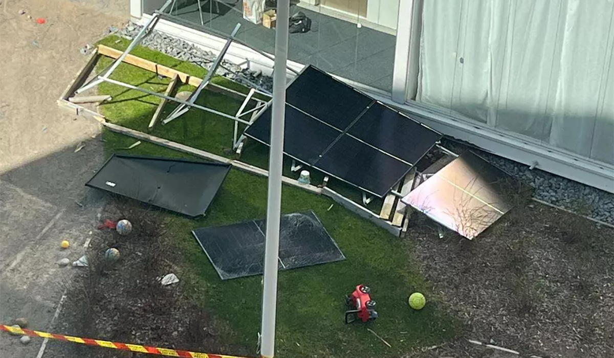 Tema sõnul ei paistnud alla kukkunud päikesepaneelid hoonele ega ümbrusele olulist kahju tekitanud, vahendab Iltalehti.