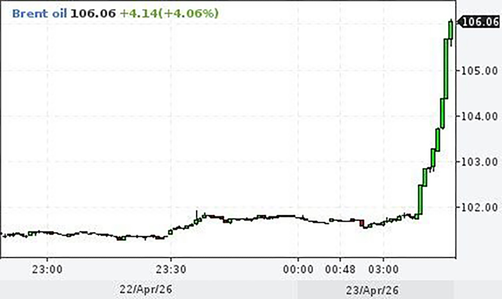 Nafta hind hakkas täna neljapäeval, 23. aprillil taas kiiresti tõusma. Enimkaubeldud toornafta Brenti hind kerkis 106 dollari peale barrel.