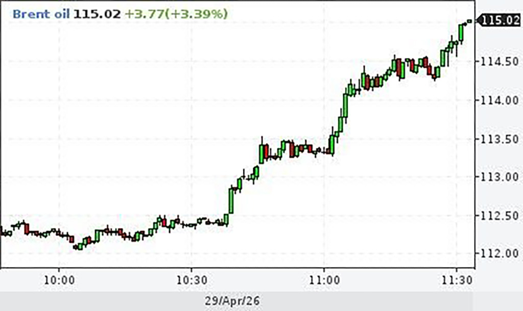 Enimkaubeldud Brenti toornafta hind kerkis täna kolmapäeval, 29. aprillil 115 dollari peale barrel. Hind on viimastel päevadel kiiresti kerkinud.