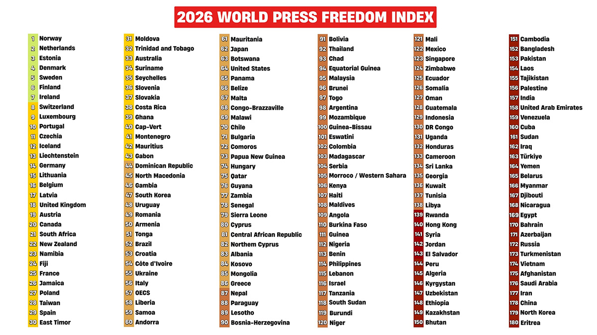 Nii Eesti kui Soome kukkusid tänavusel 2026. aastal maailma ajakirjandusvabaduse indeksis koha võrra tahapoole.